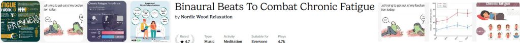 There are no existing studies of music therapy in CFS, but it has been proven effective in patients with related problems such as fibromyalgia and stress. Purple Noise with alpha (9.76Hz) frequency is recommended.